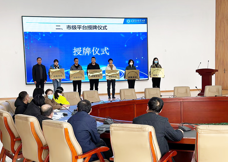 首先,科技处副处长吴慧媛宣读校级科研创新团队和市级技术创新中心的批建文件,同时举行了授牌仪式,校长王忠诚为获批的市级技术创新中心授予牌匾。科技处处长刘连利就科研平台建设、创新团队建设、深入开展企业技术需求调研、基础技术服务“大篷车”活动等重点工作做了工作部署。