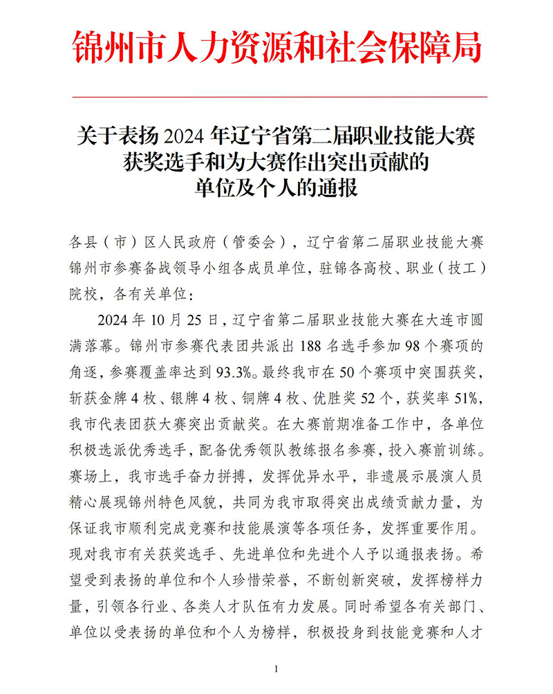 近日,锦州市人社局发文,对2024年辽宁省第二届职业技能大赛中表现突出的选手及为大赛作出重要贡献的单位和个人进行了通报表扬。beat365在此次大赛中表现突出,选派的30名参赛选手中有11人荣获大赛优胜奖,beat365荣获了锦州市人社局表彰的“突出贡献单位”称号,郭锐、王珏获得“突出贡献个人”荣誉。