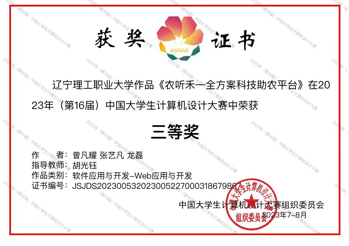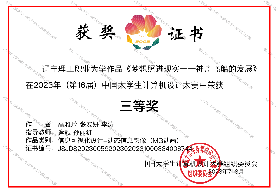 近日,2023年(第16届)中国大学生计算机设计大赛落下帷幕,信息学院学子再创佳绩,软件工程技术专业的曾凡耀、张艺凡、高雅琦等同学分别在软件应用与开发、信息可视化设计两个赛项中获得全国三等奖的好成绩。