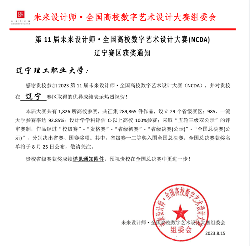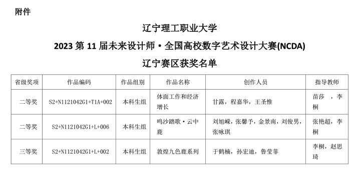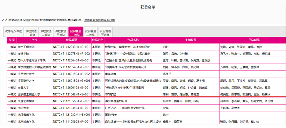 未来设计师·全国高校数字艺术设计大赛(NCDA)“学生组”和“教师组”均已连续入选教育部中国高等教育学会发布的《全国普通高校教师教学竞赛排行榜》及《全国普通高校教师教学竞赛项目》,并通过了十二个省教育厅的发文认定。艺术设计教师教学创新大赛(教创赛)是国内首个聚焦艺术设计学科教学创新竞赛,2023年本项大赛共有来自465所高校的1773支参赛队伍,参赛教师共7252名,以省/自治区/直辖市为单位设立29个赛区。参赛作品经校赛推选,各省赛区分别决出一、二、三等奖。按照赛制规定获得省级一等奖作品将晋级全国赛。大赛设“教学课程”和“教学案例”两个赛道,采取校级赛、省级赛、全国赛三级赛制,致力于打造艺术设计学科权威、公正、领先的教师竞赛。其中在“教师组”中我院指导老师李桐、苗莎、任骏原、韩倩雯四名老师指导的学生佟美慧、彭思晨、郁浩楠、王瑞、杨鞠冰等五名同学获得省赛一等奖。