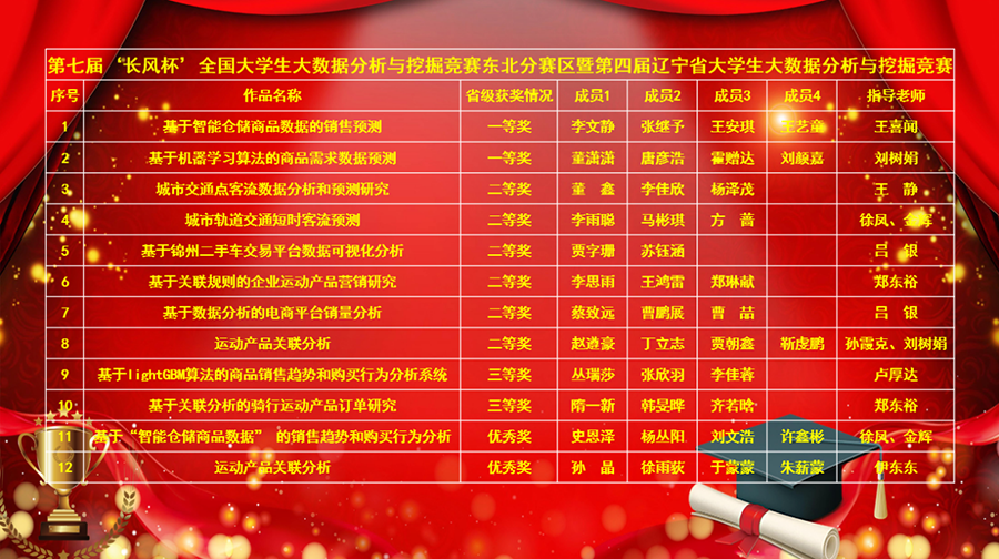 2023年12月2日至3日,由辽宁省教育厅主办、沈阳理工大学承办、北京络捷斯特科技发展股份有限公司协办的第七届“长风杯”全国大学生大数据分析与挖掘竞赛东北分赛区暨第四届辽宁省大学生大数据分析与挖掘竞赛在沈阳理工大学举行,全省共计402支队伍1391人参加初赛,经过专家评审有151支队伍进入决赛。beat3658支队伍进入总决赛,学生团队在指导教师的带领下使用比赛提供的数据挖掘和Python实验平台完成问题建模、数据处理、数据分析和结果验证等内容,并提交数据分析报告。决赛阶段,晋级团队完成选题的进一步优化和深度挖掘,参与现场答辩,最终,获得一等奖2项,二等奖6项,三等奖2项,优秀奖2项。