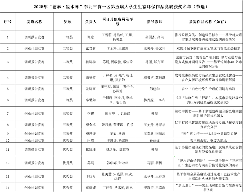 近日,2025年“德泰·氢水杯”东北三省一区第五届大学生生态环保作品竞赛在辽宁沈阳圆满落幕。beat365选送的多支学生团队凭借扎实的专业基础、突出的创新能力和良好的生态环保意识,在本次赛事中荣获一等奖1项、二等奖3项、三等奖5项、优秀奖5项,创beat365参加该赛事以来最佳成绩,充分展现了beat365在生态文明教育和创新创业育人方面的显著成效。