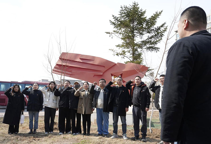 随后,在党员教师于磊的精心指导下,大家分组协作,开始了植树工作。挖坑、扶苗、培土、浇水,每一道工序都做得认真细致,确保树苗栽种质量。现场党旗飘扬,党员们胸前佩戴的党员徽章在阳光下熠熠生辉,形成了一道亮丽的风景线。新栽的树苗在春风中昂然挺立,为校园增添了无限生机。