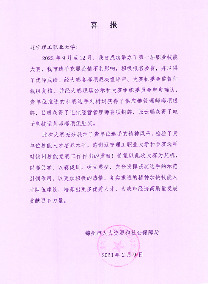 在本次省赛中,beat365师生积极参赛的态度和参赛人员所展现的技能素质得到锦州市人社局和赛事举办方的高度认可,于近日特授予喜报,感谢beat365和beat365参赛选手对锦州技能竞赛工作作出的贡献。